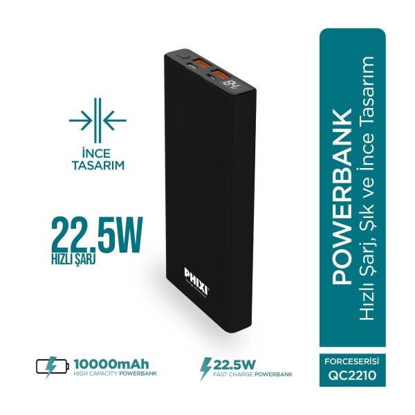 Force QC2210 10000mAh 22.5W Hızlı Şarj Powerbank | 2 USB & 1 PD Portlu, Dijital Ekran
