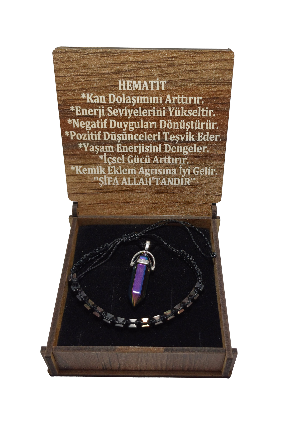 - Set İçeriği: Ayarlanabilir ipli (Shamballa) Hematit boncuklu bileklik ve modern Çivi Kesim Hematit kolye ucu.